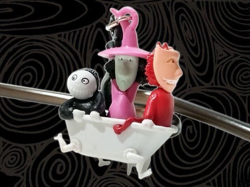 くるっと回転したプラスチックストローに、バスタブに入った小さいトリーターズのフィギュアが付いています。