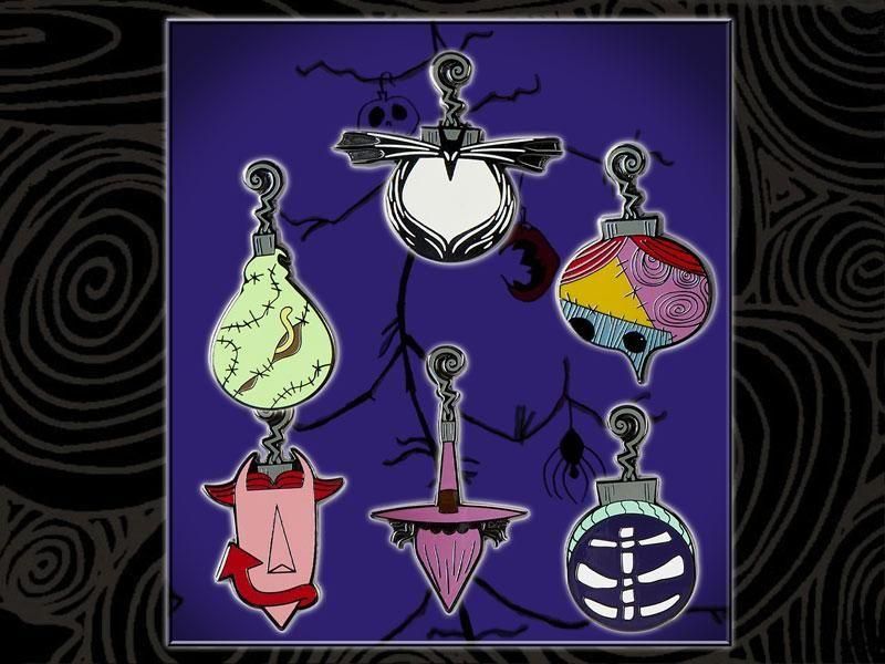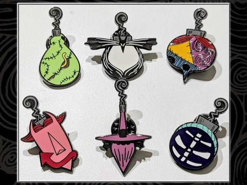 ジャック、サリー、ゼロ、ウーギー・ブギー、ロックショックバレルをオーナメント風にデザインしたピン。